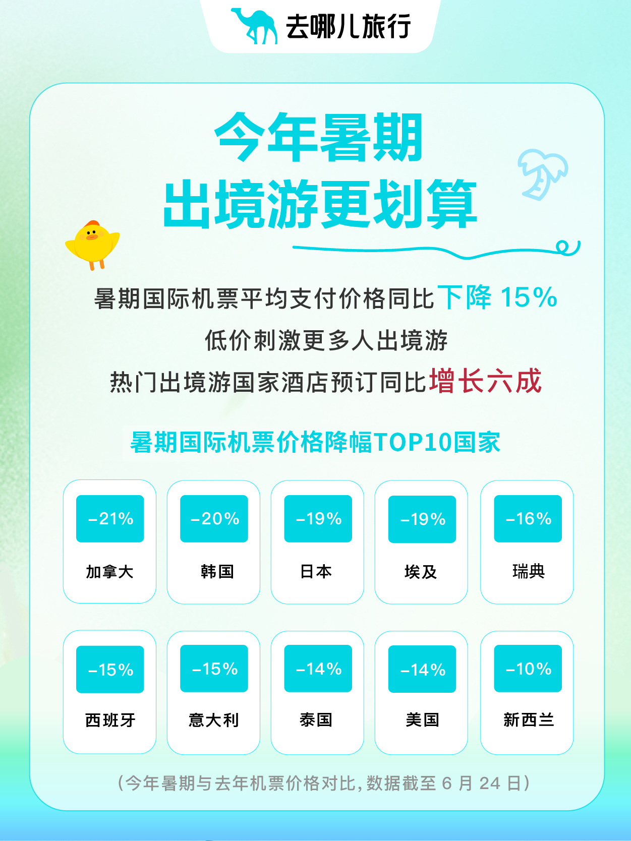 随着出境航班的增加,今年暑假出境游更便宜了。截至目前,去哪儿平台上国际机票平均支付价格较去年同期下降了15%。其中,加拿大、韩国、日本、埃及和瑞典机票价格下降最多,降幅近两成;西班牙、意大利、新西兰、美国和泰国,机票价格下降15%左右。