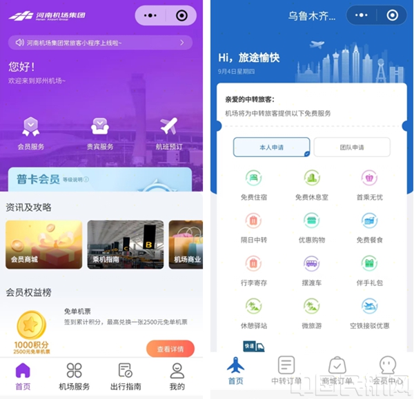 由同程旅行开发的河南机场集团常旅客小程序与乌鲁木齐机场中转小程序