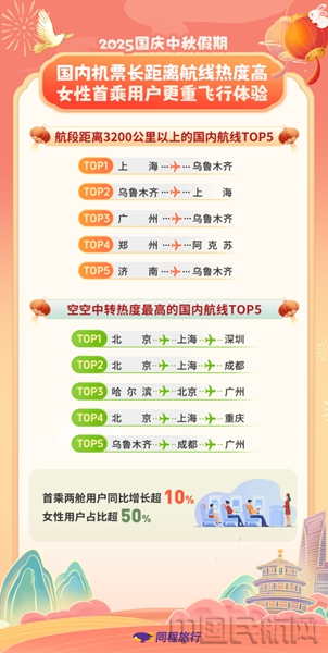 《中国民航报》、中国民航网 记者许晓泓 报道:10月8日,同程旅行发布《2025国庆中秋假期旅行消费报告》(以下简称“报告”)。报告显示,在返乡探亲和大众旅游双重需求叠加的背景下,今年国庆中秋假期,长线跨省、跨境旅行趋势明显,整体呈现走得更远、玩法更多、品质更高的特征。国内游方面,机票长距离航段增速显著,高速、高架、高铁新线路的开通,不仅提升了跨省旅行的效率,也将沿线热门景区串珠成链,形成区域黄金旅游带;而签证政策的优化,以及国际航班的增加,使得出入境市场供需两旺。