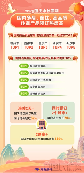 今年国庆中秋假期,国内住宿市场呈现出连住酒店订单增速快、跨城市酒店预订频次高、非一线城市高品质酒店和多居室民宿预订热度高的特征。同程旅行数据显示,今年国庆中秋假期,国内酒店整体预订热度同比增长超过65%,连住2天及以上的国内酒店预订热度同比增长超过52%。8天长假,叠加拼假出行策略,为用户开展高频次的本地周边游,以及横跨多省的长线旅游提供了充裕的时间。假期中,同时预订2个及以上城市的用户占比,同比增长超过20%。