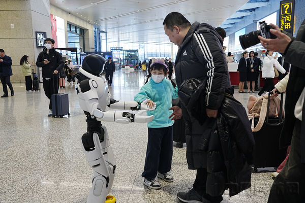 春运出行旅客在虹桥机场与东航的服务机器人互动(张弘历/摄)