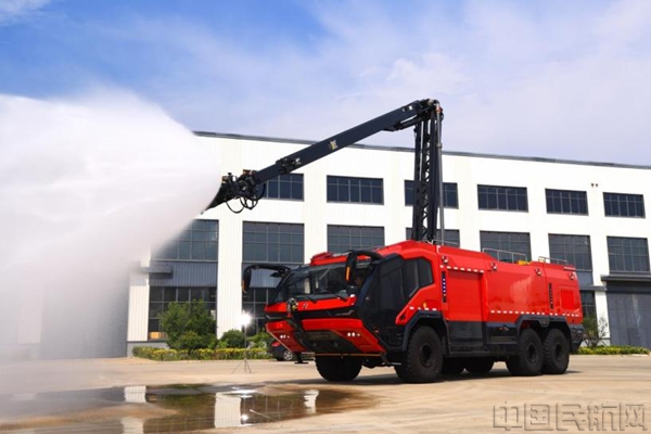 另一款引人注目的产品是机场主力消防车。该车型具备14吨超大载液量和内置干粉系统,即使在40公里/小时行驶中仍可同步喷射灭火剂,实现快速险情控制。装备17米高强度穿刺臂,可有效破除飞机蒙皮,处置内部火情。驾驶室采用高强碳纤维材料,满足应急冲撞障碍物的高标准安全需求。车辆基于自研6×6重型越野底盘,可在40%坡度条件下全功率打水,出色适应各类恶劣场景。高度自动化的智能控制系统支持一键快速灭火,显著提升救援响应速度与作战效能。