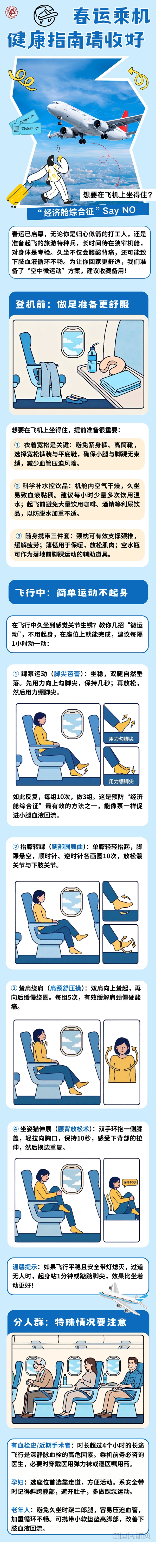 为了飞行中的舒展,健康提示中,特意整理了一套无需起身的“空中微运动”,建议旅客每隔1小时开展一次。简单的踝泵运动(交替勾、绷脚尖,每组10次,做3组),能有效促进小腿血液回流,悄悄化解深静脉血栓的隐患;抬膝转踝、耸肩绕肩、坐姿猫伸展,每一个简单动作,都能缓解久坐带来的僵硬与疲惫,让漫长航程多一份轻松,让归乡的脚步更从容。航班平稳、过道无人时,起身站立1分钟或踮踮脚尖,小小的举动,都是对自己和家人的负责。