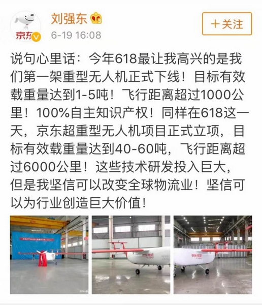 说句心里话:今年618最让我高兴的是我们第一架重型无人机正式下线!目标有效载重量达到1-5吨!飞行距离超过1000公里!100%自主知识产权!同样在618这一天,京东超重型无人机项目正式立项,目标有效载重量达到40-60吨,飞行距离超过6000公里!这些技术研发投入巨大,但是我坚信可以改变全球物流业!坚信可以为行业创造巨大价值!