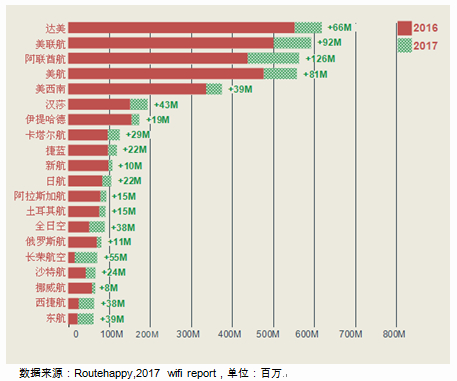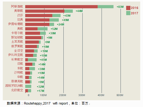 图6:2017年全球航空公司长航线机上联网TOP20(按ASM总量)