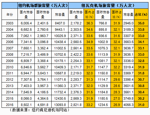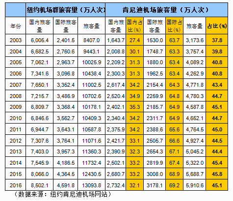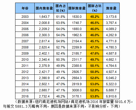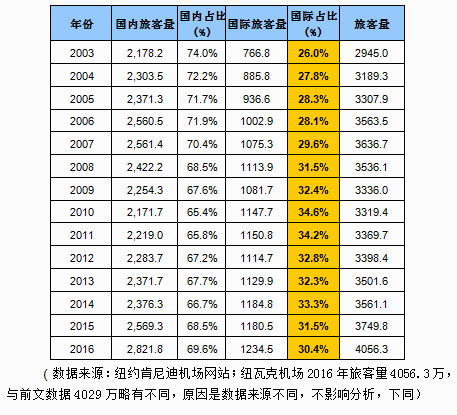 表5:2003-2016年肯尼迪机场旅客构成及占比情况