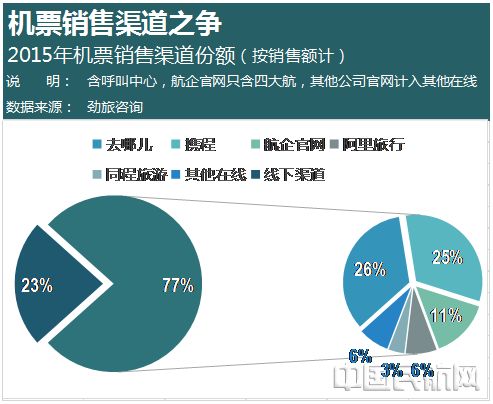 当前,随着近几年电子商务和移动互联网的蓬勃发展,在线销售已成为机票销售的主流。如下图所示,2015年有77%的机票都是通过网络卖出的,传统的线下渠道份额已经萎缩至23%。而在线渠道中,去哪儿和携程分别占据26%和25%的市场,分列前两名;四大航官网位列第三,但仅占据11%的市场份额;随后是阿里旅行和同程旅游,市场份额分别为6%和3%。因此,机票销售渠道高度集中,携程系目前已占据半壁江山(去哪儿+携程),而航空公司官网目前份额相对较低,直销业务仍有较大空间。