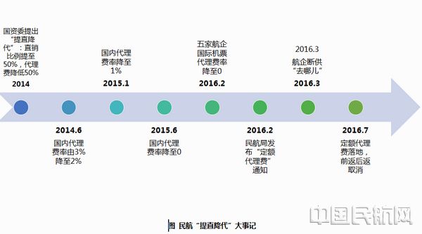 其实早在2014年,国资委就向三大航下达了“提直降代”任务:未来三年内,直销比例要提升至50%,代理费要在2014年的基础上下降50%。三大航也迅速行动起来,2014年6月至2015年6月,一年的时间里国内机票代理基础费率由3%降至2%,由2%降至1%,再由1%降至0。今年3月,主要航空公司先后宣布“断供”去哪儿,更是将直销与分销的渠道之争推向白热化。