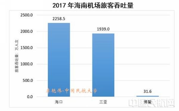 2017年海口机场旅客吞吐量2258.5万人次,三亚机场1939.0万人次,博鳌机场旅客吞吐量为31.6万人次。