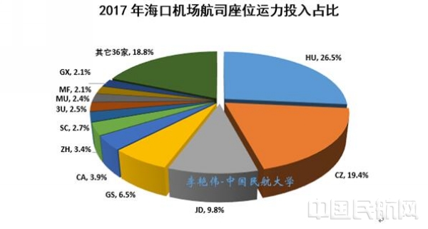 2017年共有47家航空公司在海口机场运营,其中主要航空公司为海航和南航,两航司座位运力投入占比为45.9%,其中海航运力占比为26.5%。