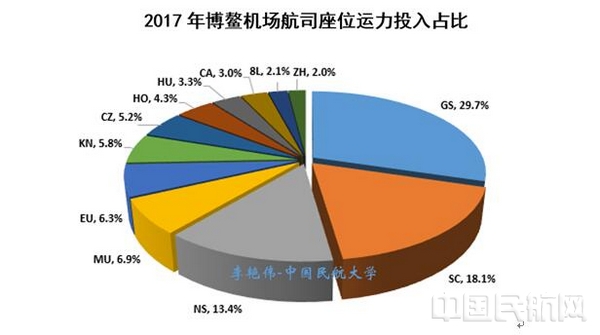 2017年共有12家航司在琼海博鳌机场运营,其中座位运力份额投入最高的为天航(29.7%)。