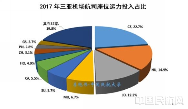 2017年共有42家航空公司在三亚凤凰国际机场运营,其中主要航空公司为南航份额最高为22.7%,海航次之为14.9%,首都航12.2%。