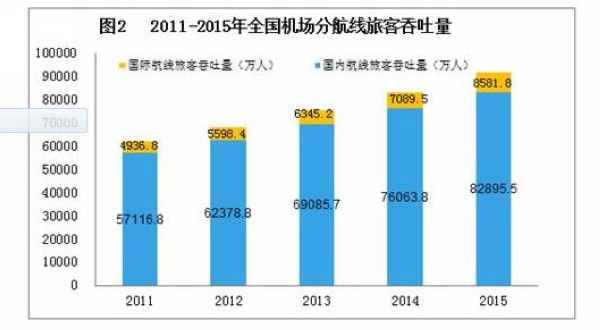2015年我国机场主要生产指标保持平稳增长,其中旅客吞吐量91477.3万人次,比上年增长10.0%。其中,国内航线完成82895.5万人次,比上年增长9.0%(其中内地至香港、澳门和台湾地区航线为2803.6万人次,比上年增长2.4%);国际航线完成8581.8万人次,比上年增长21.1%。