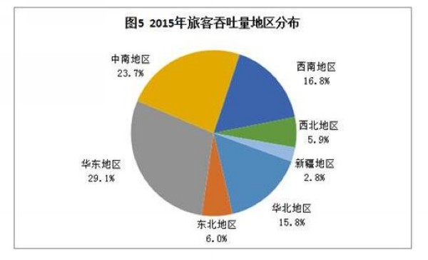 所有通航机场中,年旅客吞吐量100万人次以上的有70个,比上年增加6个,完成旅客吞吐量占全部机场旅客吞吐量的95.5%;年旅客吞吐量1000万人次以上的为26个,较上年增加2个,完成旅客吞吐量占全部机场旅客吞吐量的77.9%;北京、上海和广州三大城市机场旅客吞吐量占全部机场旅客吞吐量的27.3%。全国各地区旅客吞吐量的分布情况是:华北地区占15.8%(16.2%),东北地区占6.0%(6.1%),华东地区占29.1%(28.9%),中南地区占23.7%(24.3%),西南地区占16.8%(16.2%),西北地区占5.9%(5.7%),新疆地区占2.8%(2.6%)。(注:由于四舍五入的原因,各地区占比之和可能不等于100%,括号内为2014年数字,下同)