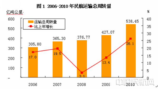 1.运输总周转量[3]2010年,全行业完成运输总周转量538.45亿吨公里,比上年增加111.38亿吨公里,增长26.1%,其中旅客周转量359.55亿吨公里,比上年增加58.71亿吨公里,增长19.5%;货邮周转量178.90亿吨公里,比上年增加52.67亿吨公里,增长41.7%。