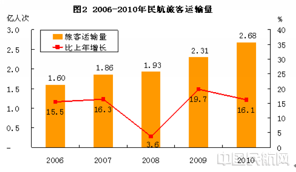 一、运输航空[2]2010年,民航运输生产实现新突破,标志着中国民航在建设民航强国道路上迈出了新的坚实步伐,中国成为全球增长最快、最重要的民航市场之一。