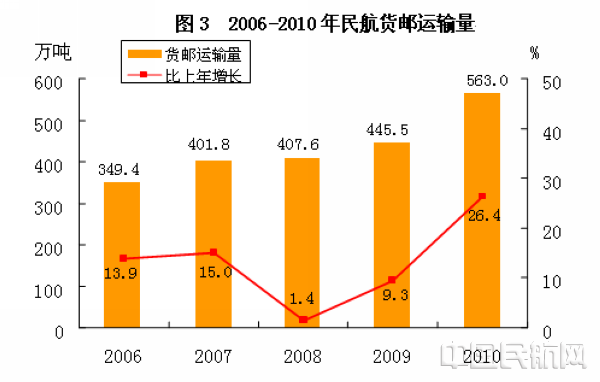“十一五”期间我国货邮运输量年平均增速12.9%。
