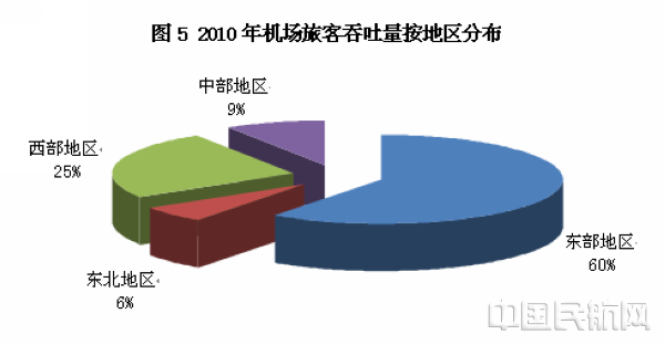 其中:2010年东部地区[5]完成旅客吞吐量3.39亿人次,东北地区完成旅客吞吐量0.34亿人次,中部地区完成旅客吞吐量0.53亿人次,西部地区完成旅客吞吐量1.39亿人次。