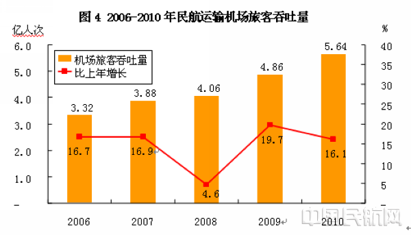 4.机场业务量2010年,全国民航运输机场完成旅客吞吐量[4]5.64亿人次,比上年增长16.1%。“十一五”期间全国运输机场旅客吞吐量年平均增长率14.7%。