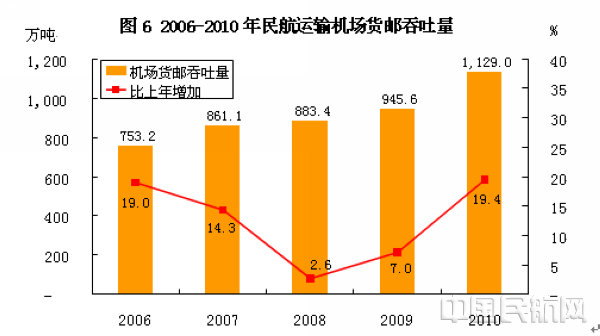 2010年全国运输机场完成货邮吞吐量[6]1129.0万吨,比上年增长19.4%。