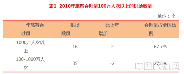 2010年,年旅客吞吐量100万人次以上的运输机场51个,其中北京、上海和广州三大城市机场旅客吞吐量占全部机场旅客吞吐量的33.1%。