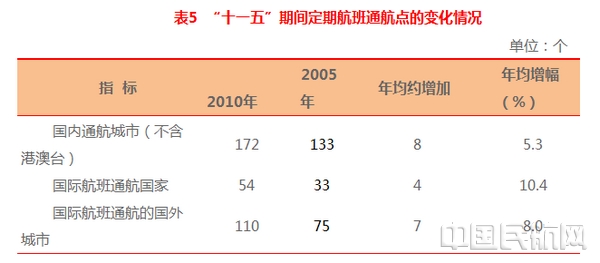 截至2010年底,定期航班国内通航城市172个(不含香港、澳门、台湾),定期航班通航香港的内地城市43个,通航澳门的内地城市5个,通航台湾地区的内地城市32个。