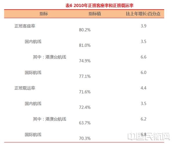 2010年,正班载运率平均为71.6%,比上年提高4.4个百分点。