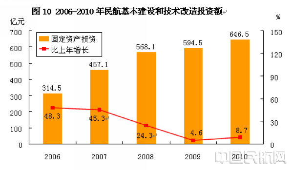 五、固定资产投资[14]2010年,民航基本建设和技术改造投资646.5亿元,比上年增长8.7%。