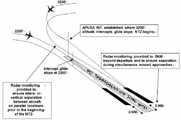 美国旧金山机场因为地形条件的限制,运营着现今世界上最为接近的近距平行跑道,两根跑道的距离只有150米。同时,为了应对枢纽港的大流量,旧金山机场在能见度大于4海里,云底高大于2100英尺的条件下,可以实施Simultaneous Close Parallel(同步近距平行进近)。在实施同步平行进近的时候,28L跑道实施常规的ILS进近,28R跑道实施偏置航向道的LDA进近。一般在距离旧金山机场100海里以外,区域管制员会告知航班需要实施LDA进近,如果机组不具备此能力,可以及时告知管制员,以便管制员重新安排落地次序。在28L做ILS进近的航班,进近管制员指挥其保持3200英尺,在NTZ以外建立航道。在28R做LDA进近的航班,进近管制员指挥其保持2200英尺,截获偏置3度的航向道,并保证其与在28L跑道进近的飞机有足够的水平和垂直间隔。随后,在28R进近的飞机建立跑道以及左侧进近飞机的目视间隔后,继续由塔台指挥落地。在此过程中,两架飞机均要将第二套甚高频,在指定的频率内打开扬声器进行长守,以防波道卡阻造成通讯失效。