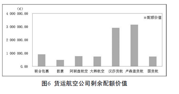 图3 显示了阿联酋航空、大韩航空、联合包裹、敦豪、国货航以及欧盟地区的汉莎货运、卢森堡国际货运的、剩余配额所占比例。从图3 可以看出,欧盟国家航空公司,不管是汉莎货运航空、卢森堡国际货运航空这种全货运航空公司还是敦豪这种航空物流公司,其剩余配额所占比例均达到40% 左右;而非欧盟国家航空公司,即使国货航这种快速发展的货运航空公司,剩余配额所占比例也仅为25% 左右,联合包裹这种航空物流公司的剩余配额比例不足20%,而阿联酋航空的剩余配额比例仅为5% 左右,差距非常显著。