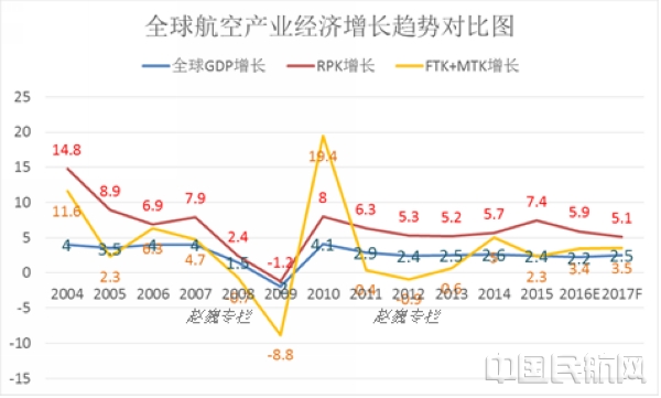 2004年-2016年全球航空旅客周转量(RPK)和全球GDP增速的线性拟合曲线为y=2.07*x,相关系数高达0.86。基本上航空旅客周转量的经济乘数效应为2,现代航空业的快捷联通服务能够极大地推动区域对外开放和经济发展。同样全球航空货物周转量与经济发展速度也相关,但是较低的经济增长速度难以支撑航空物流正效应,一般而言,GDP增速如果低于2%,则难以维持正的航空货运增长!
