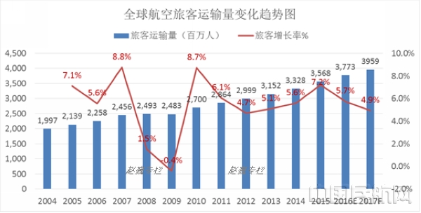 2015年全球航空旅客运输量达到35.68亿人次,2016年将达到37.73亿人次,2017年预测将接近达到40亿人次。近20年来,现代航空客运量一直保持增长,只有2008年全球经济危机后的2009年小幅下降0.4%。2008年金融危机之后,基本保持5%的年增长率。
