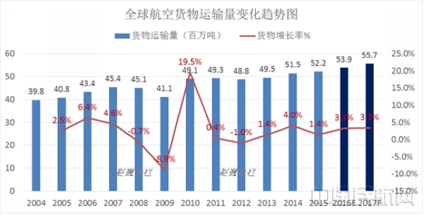 全球航空货运发展在2008年经济危机后进入低谷,2009年全球航空货物运输量下降8.9%,经过量化宽松政策刺激2009年超低反弹增速19.5%,但是2010-2013年基本处于徘徊状态。2014年全球航空货物运输量增长4%,达到5150万吨;2015年全球航空货物运输量增长1.4%,达到5220万吨;2016年预计全球货运量增长3.3%,达到5390万吨,预测2017年保持3.3%左右的增速,达到5570万吨。航空货运属于高端物流服务,当前全球航空货运总量大约只占到全球贸易总量的1%左右,但是航空货运的货值要占到全球贸易总货值的三分之一以上,每天全球航空货运货值超过186亿美元。