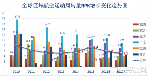 可以看出中东航空运量增速最快,亚太增速同样较快,而且高于全球平均水平。欧洲和北美航空运量增速略低于全球平均水平。2016年全球航空运输周转量RPK增长5.9%,其中中东增速10.8%,亚太增速8.9%,欧洲增速3.8%,北美增速3.2%。预测2017年全球RPK增速5.1%,其中中东增速9%,亚太增速7%,欧洲增速4%,北美增速2.5%。