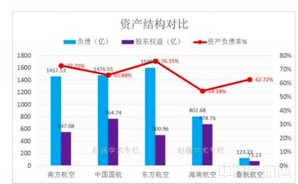 海南航空通过股权融资扩大规模,净资产已经超过南航和国航,而且负债率降到54%。