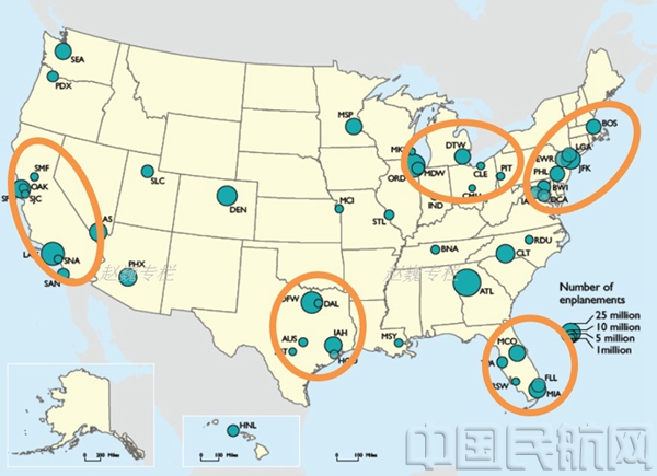 三、美国主要城市群及主要航空枢纽的分布特征