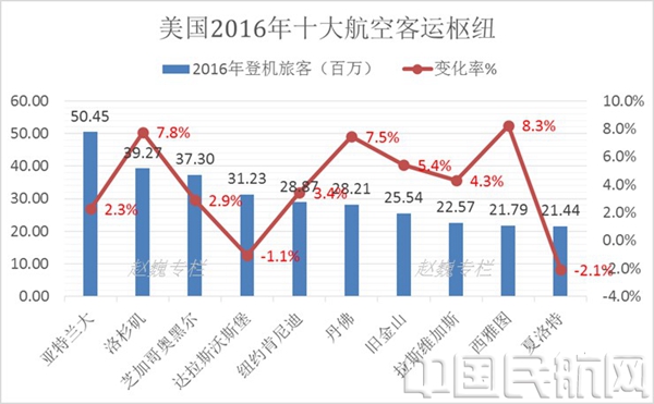 图2:2016年美国十大客运航空枢纽
