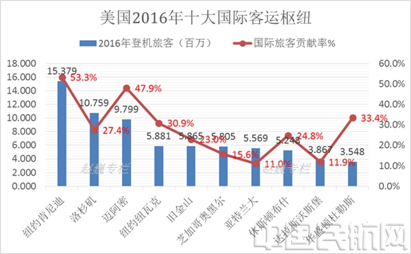 图3:2016年美国十大国际客运航空枢纽