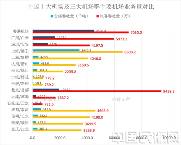 长三角上海浦东和虹桥双雄领衔中国龙头,上海成为中国第一个一市两场的城市,而且上海也是中国最大的商业城市,上海两场的航空货运领先全国,上海两场的旅客吞吐量已经超过北京,突破一亿人次。上海浦东机场是中国大陆最大的国际航空枢纽,货运吞吐量全球第三,国际货运吞吐量全球第4,不仅仅落后于香港,而且落后于韩国仁川机场,上海浦东机场旅客吞吐量全球排名第九,国际旅客吞吐量全球排名20之后。上海虹桥因为受到地域空域限制,近两年旅客吞吐量已经被成都、昆明和深圳超越,未来浦东的基础设施扩建也成为必要之举。上海周边杭州、南京、合肥、宁波以及无锡等都有机会补位发展。上海是中国最大城市以及全球十大城市,亚太第二大城市,当前上海港海运业务量已经逐步超越香港和新加坡成为亚太最大的港口,上海浦东机场应该努力发展成为亚太区域第一大国际航空枢纽,引领长三角经济发展以及中国长三角城市群全球化发展,为亚太最大的航运中心做出贡献。